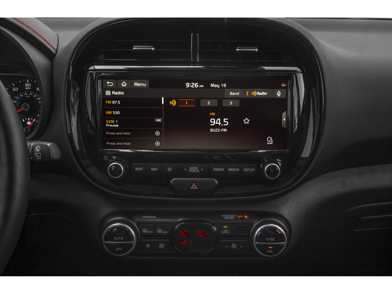 - Radio: AM/FM/MP3 UVO Link Audio System -inc: navigation, HD radio, SiriusXM, 10.25" color touch screen, 6 speakers, speaker lights w/multiple ambience settings, support for Android Auto and Apple CarPlay, harman/kardon sound system w/center speaker, subwoofer and external amplifier, USB connectivity, and Bluetooth® wireless technology